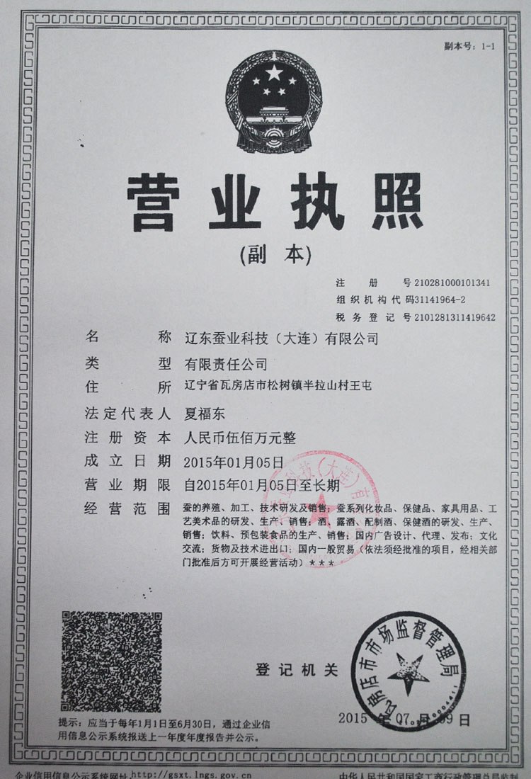 荣誉资质 证书介绍 辽东蚕业科技有限公司坐落于素有北方明珠之称的辽宁省大连市,是一家以柞蚕养殖、研发、生产、销售及文化交流为一体的大规模实业公司,公司产品涉及酒业、食品、保健品、化妆品、家居用品等多个领域,自上市以来,其各产品受到了客户的一致认可和好评。