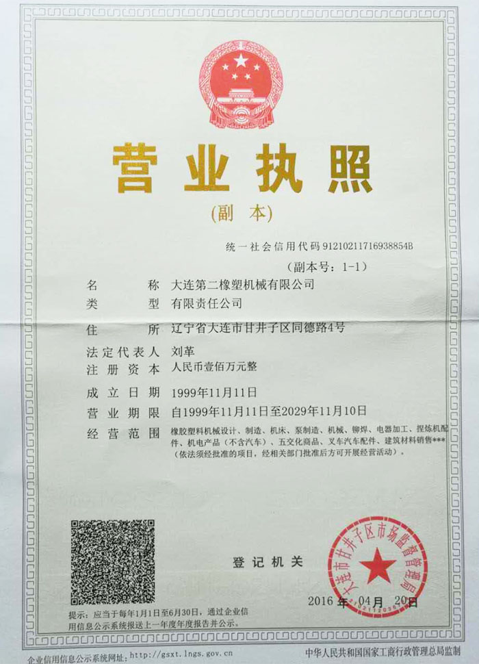证书介绍 大连第二橡塑机械有限公司,始建于1972年,系原国家化工部定点工厂,是专业研制开发、生产销售及服务维修为一体的综合橡塑机械厂。1987年引进“日本森山株式会社”橡胶机械技术,并在1992年开始批量生产“加压式捏炼机”。主要产品有各种规格的橡胶(塑料)加压式捏炼机、密炼机、开炼机、橡胶(塑料)压延机、橡胶过滤挤出机、XY系列压延机、胶片冷却机等。