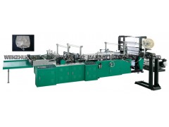 该设备由本公司参照国外技术进行改进设计制造的,它选用的LDPE、HDPE等塑料膜为材料,专产穿带式垃圾袋或BOPP、PP平口袋。 该机采用伺服电机,电脑控制,电眼跟踪,自动温控,自动计数,自动报讯;同时具有折边、剖口、穿带、打孔等功能,一次完成,且封口封边牢固、规范、美观。