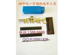 AB咔吧极速快开工具经过改进可适合各种口径平口AB咔吧锁,多加了一个螺丝眼,这样就变成任意换头,插入正槽这一头就是正槽工具,插入另一头就变味反槽工具,,可以用螺丝固定,由原来只有一个正槽和一个反槽改变为有两个正槽两个反槽工具,这样经过改进,工具的耐用率和使用率有多了一倍. 经过改进把手,使工具受力更均匀,工具头经过淬火热处理,硬度更高,适合开启各种口径平口AB咔吧锁,工具配10根成品锡纸条