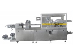 PVC经加热软化后,进入成型模腔吹气成型,经泡罩检测后加入被包装物进入冲切站,冲出所需的塑托,然后塑托经分托过渡装置进入多工位转盘机构,最后入纸塑热封站与吸塑纸卡压合,压合后成品下滑至成品输出装置进入下一工序。所有工位同步工作。成型及加料之后可设置检测装置以防止泡罩成型不良或缺料,废品经废料出口剔除。