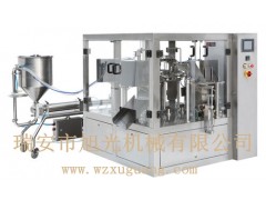 这套设备由给袋式全自动包装机与液体、酱体灌装机配套而成,主要适用于果汁、番茄酱、调味酱、辣椒酱、洗手液、洗涤剂等液体、酱体物料的自动计量包装。