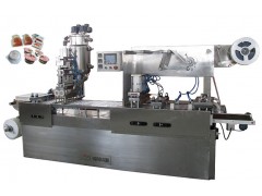 本机适用于果酱,巧克力,黄油,奶精等食品的加热融化泡罩灌装封合包装。从泡罩成型到液体灌装再复合膜封合,压痕,到最后的冲裁成品输出流水线全自动,大大减少人工成本。
